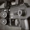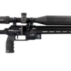 Air source is a 300cc carbon fiber bottle attached in the rear and is filled via a rear located foster quick disconnect. The Dynamic Block has a larger breech than previous rifles that allows projectiles up to 13mm in length. It uses the Standard Side-Shot Magazine but with a newly designed deeper lid to accommodate longer length slugs. The FX Panthera employs the Quick Tune System (the same as found on the FX Impact M3), uses a 20MOA picatinny scope rail, comes standard with a zero-angle AR grip, and has an ambidextrous sidelever cocking handle that is reversible to the left side of the rifle. Dual angled Manometers on the left side of the block show the bottle pressure and the regulated plenum pressure.
