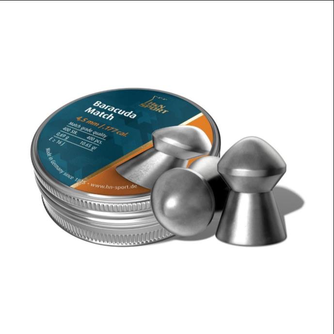 The H&N Baracuda Match in .177 (4.51–4.52 mm) is a heavyweight match pellet engineered for long-range accuracy and reliable terminal performance. At 10.65 grains (≈0.690 g) this pellet combines an optimized aerodynamic profile, specially formulated alloy and lubrication to deliver the tightest shot groups, reduced lead fouling and consistently repeatable shot patterns. Manufactured and packaged in separated batches for uniformity, Baracuda Match is the go-to choice for Field Target competitors and hunters seeking extra impact and penetration at distance. Supplied in tins of 500.