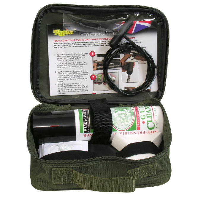 The introduction of the new ULTRACLEAN material recently has allowed Napier to develop a remarkable new Universal Rifle Pull Through Cleaning Kit. Using the High performance dual action properties of ULTRACLEAN, combined with the proven cable pull through tool, it is now possible to effectively clean any gauge of rifle from 17hmr to large bore sporting and big game calibres.The new kit contains everything that is required to clean a sporting rifle in the field or at home, all contained in a handy zip case, that will also accommodate other items such as spare magazines etc.