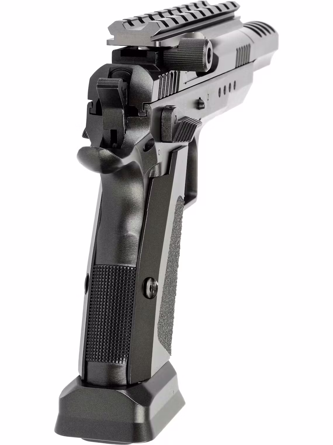 The pistol is equipped with an 18-round magazine, allowing for extended shooting without constant reloading. Its ambidextrous safety makes it suitable for both left- and right-handed shooters, while the CNC machined grip panels provide a secure, comfortable hold even during rapid fire.