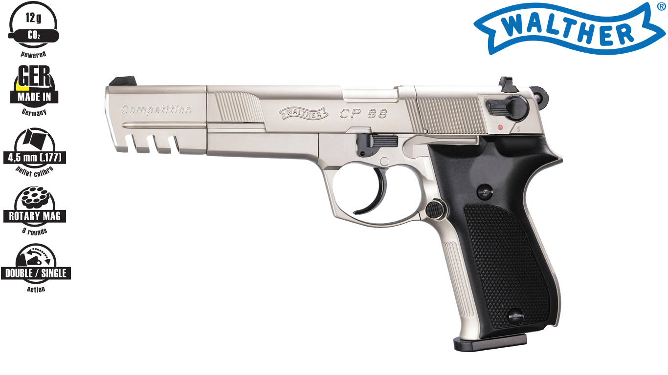 The Walther Cp88, a high-quality, genuine full-metal replica of the Walther P88, is a true piece of history. It was the first pellet-shooting CO₂ pistol in the Umarex product range – a milestone for the company. In precision, performance and reliability it set standards for the current generation of airguns. Made in Germany, it continues to inspire both sport shooters and recreational shooters.