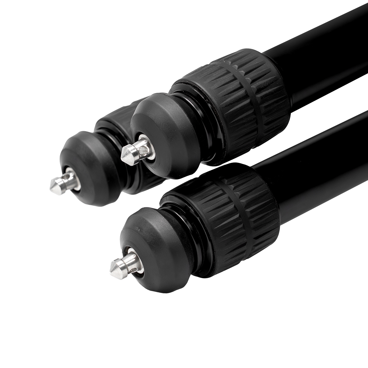 The tripod has a height range from 410 mm to 1,755 mm, with three leg sections and multiple angle positions (24° / 55° / 86°). Twist-lock leg controls allow rapid deployment and secure setup on uneven terrain, while rubber feet with retractable spikes and a ballast hook enhance stability in challenging conditions.