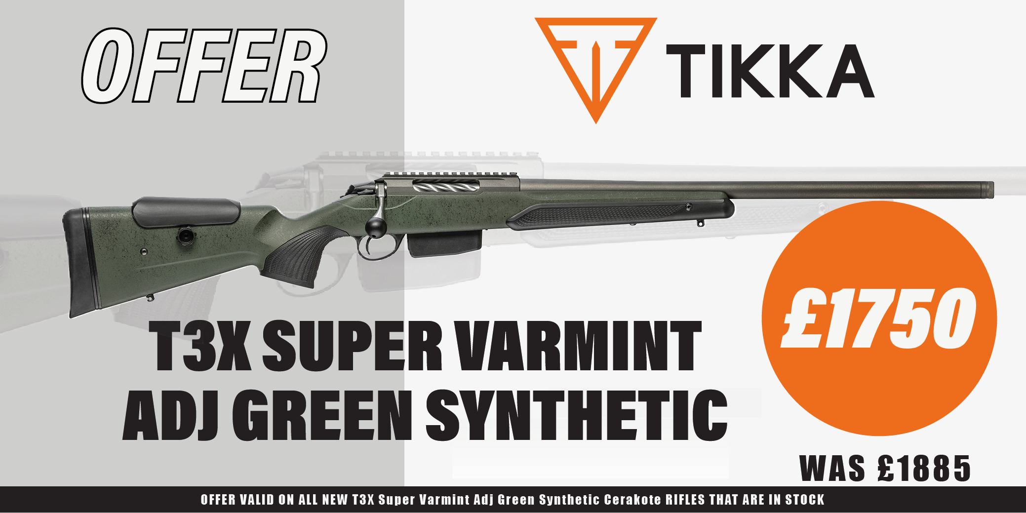 Delve into our latest promotions to uncover a variety of new stock and items with ongoing deals. ANSCHUTZ 1710 XLR BLACK £2395 ONLY View Promo SEEKINS HAVAK BRAVO £1999 ONLY View Promo FREE MODERATOR WITH HAVAK PH2 View Promo SAVE UPTO £199 ON WEIHRAUCHS View Promo CHIAPPA RHINO 120DS GOLD MEDAL View Promo TIKKA T3X SUPER VARMINT SALE View Promo CLOTHING SALE View Promo 20% OFF ALL BARNES AMMO​ View Promo 25% OFF on SPEER View Promo Weatherby High Country & Meateater £899 View Promo FREE .284 SHEHANE DIE SET KIT WITH ANY .284 SABATTI RIFLE View Promo